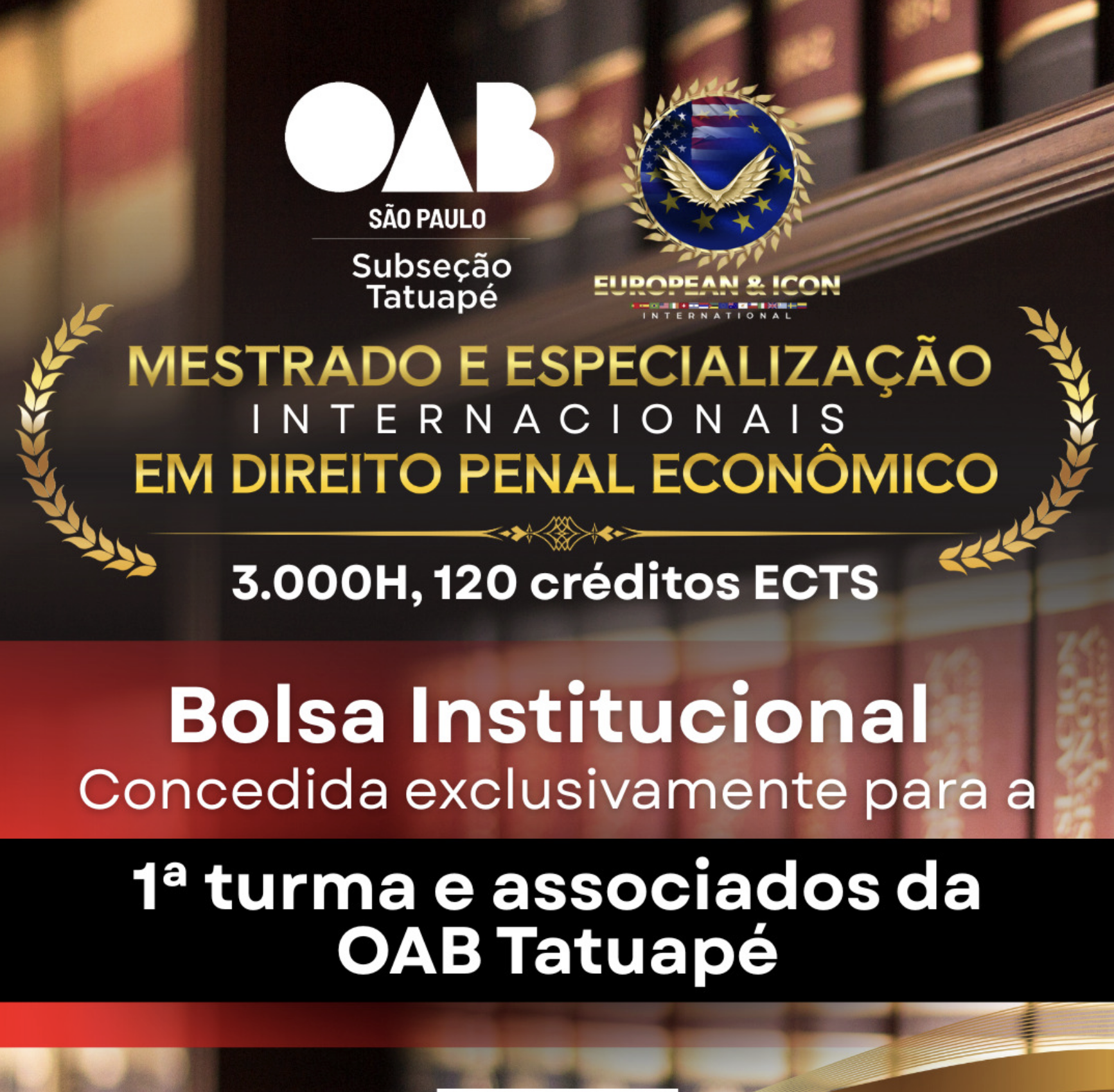 Bolsa Institucional de Acesso Internacional Concedida exclusivamente para a 1ª turma e associados da OAB Tatuapé, esta bolsa representa uma oportunidade única de ingresso no Mestrado Internacional em Direito Penal Econômico, programa com Diploma Europeu e Certificado Americano.